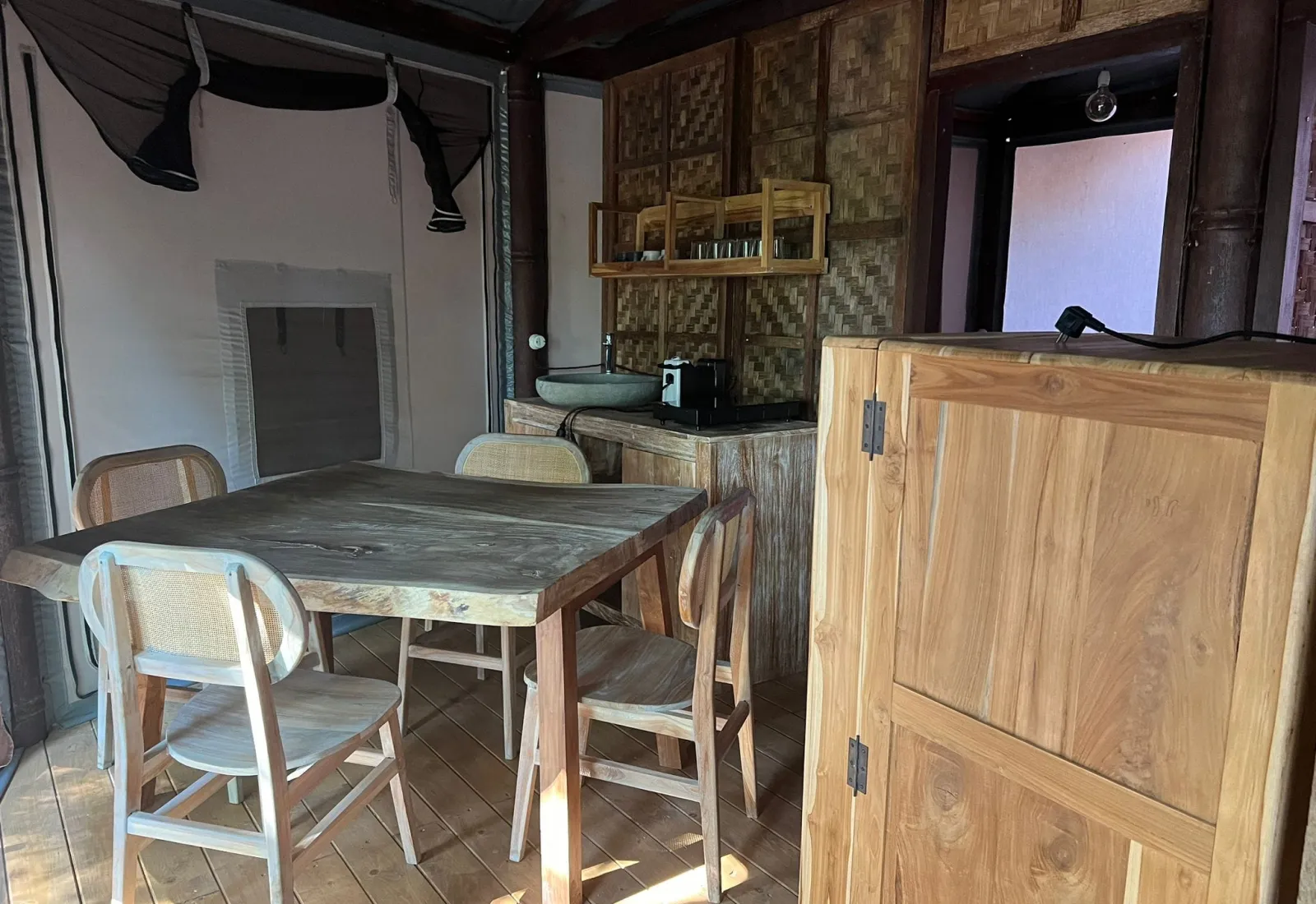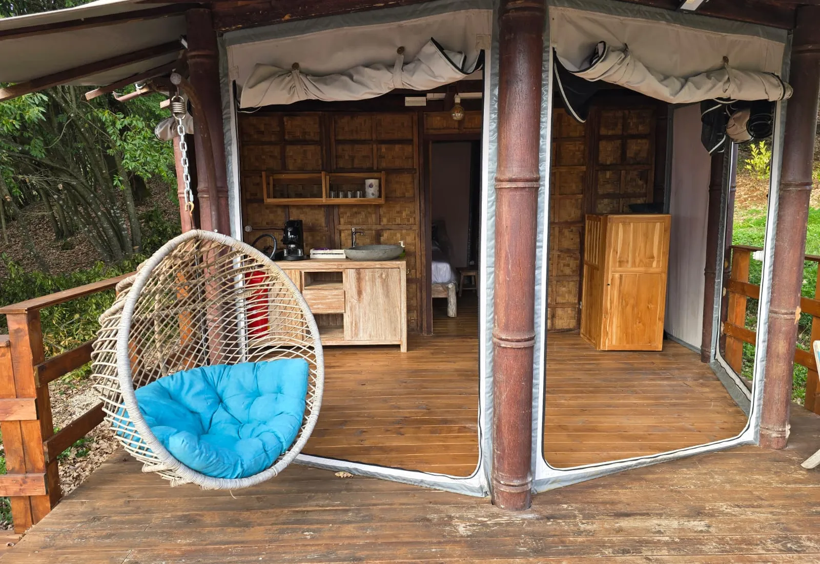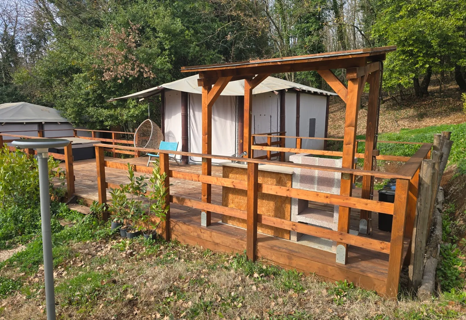 Tenda Glamping La Magnolia30 mq 2 persone 1 letto Prato e bosco Tenda con camera matrimoniale, bagno, cucina attrezzata e terrazza con doccia esterna. Dispone, inoltre, di un barbecue e vasca idromassaggio. |