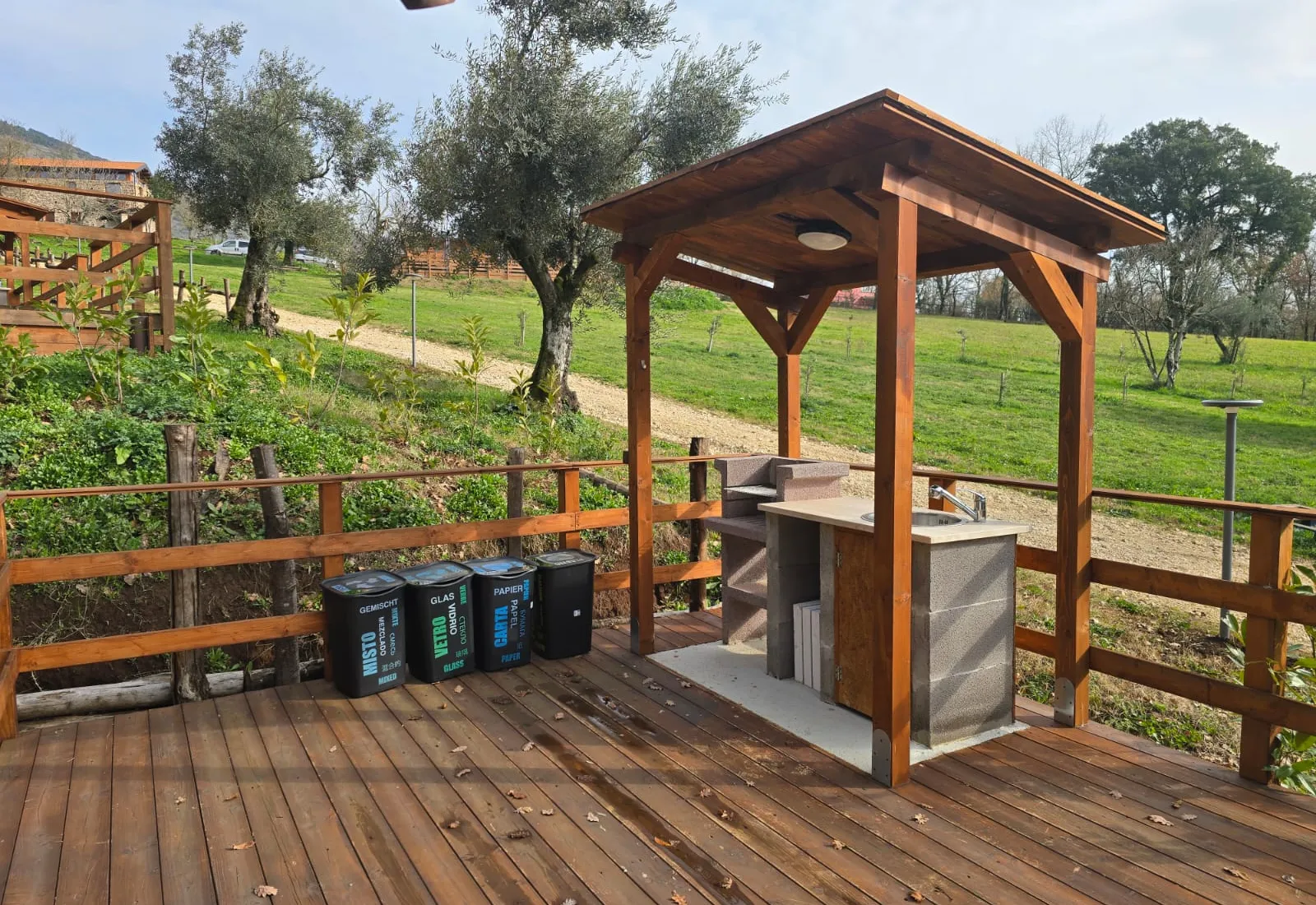 Tenda Glamping Gli Ulivi e L'Olmo40 mq 4 persone 3 letti Prato e bosco Composta da una camera matrimoniale e una camera per bambini con due letti singoli, bagno, cucina attrezzata e terrazza con doccia esterna. Dispone inoltre di un barbecue e di una vasca con idromassaggio.