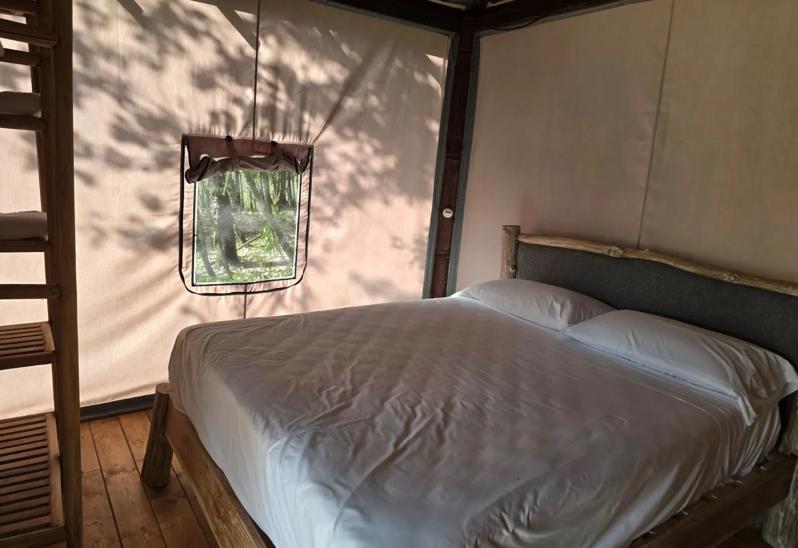 Tenda Glamping Le Querce40 mq mq 4 persone 2+1 letti Prato e bosco Tenda familiare con cucina attrezzata, una camera matrimoniale e una cameretta per le bambine e i bambini con 2 letti singoli, un bagno e una terrazza dotata di doccia esterna e barbecue. |